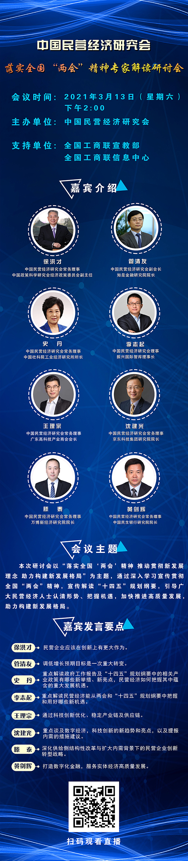 2021年全国“两会”政府工作报告和“十四五”规划纲要有哪些新举措、新亮点,站在“十四五”开局和全面建设社会主义现代化国家新征程开启的新起点,民营经济发展会有哪些新机遇、如何抓住和用好这些机遇?为了对这些问题进行深入的探讨,中国民营经济研究会邀请部分专家和企业家理事贡献同心同向之力,将于2021年3月13日下午14:00,召开“落实全国‘两会’精神 推动贯彻新发展理念 助力构建新发展格局”专家解读研讨会,直播间等你!