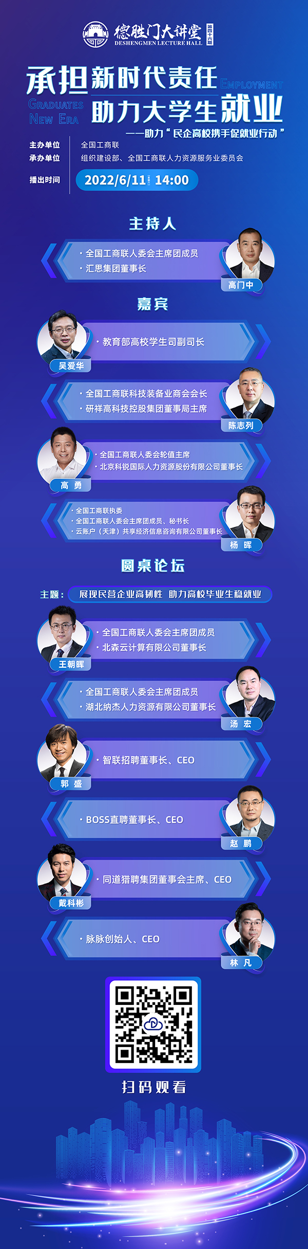 第46期德胜门大讲堂6月11日14点全网播出,助力“民企高校携手促就业”行动,敬请收看!
